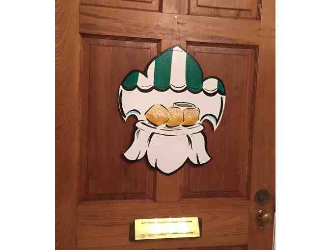 You are bidding on a Cafe Au Lait door hanger in a fleur de lis shape with a beignet design from Betty Hunley Designs. This decoration depicts a perfect New Orleans breakfast or late night snack! It is woodenz and hand painted. Ready to put on your front door.