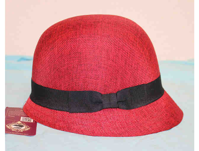 Angela & William Linen/Cotton Red cloche hat with drawstring adjustment inside of hat.