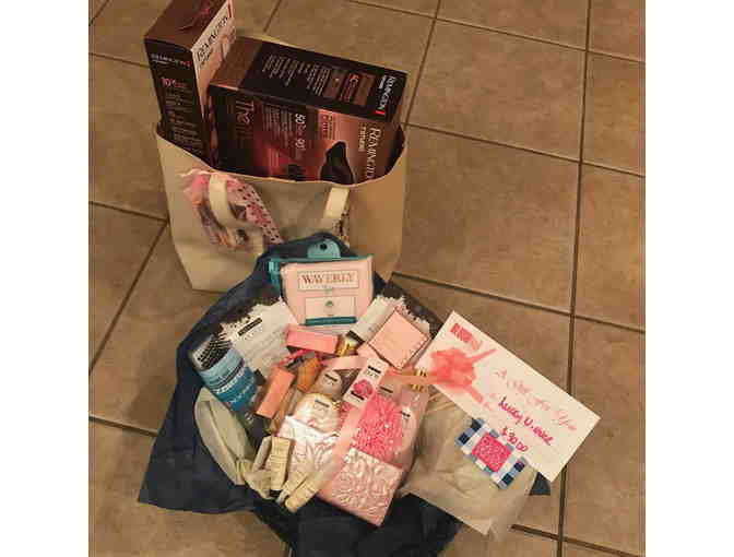 Pamper yourself with a beautiful spa basket. The basket includes a $30 blush gift certificate, $10 Bath and Body Works gift card, MARY Kay compact with makeup, Remington hairdryer and straightener, Ulta bag and lotion.