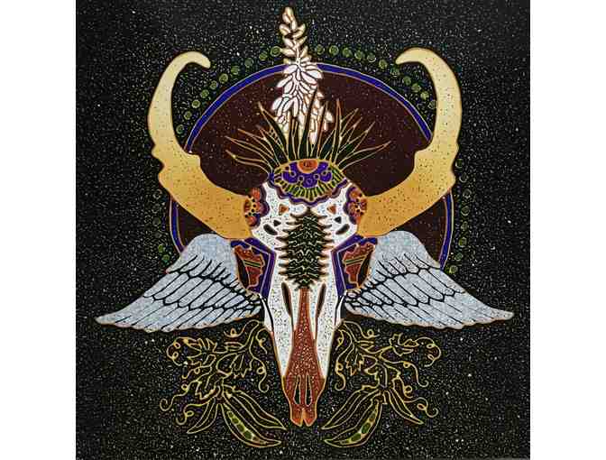 This is a print from her Skullscape series titled, "Antelope Skull over Landscape Arch: detail". It is a print on professional photographic paper and mounted to a black foam board. It measures, 8" x 8" x 1.5".
