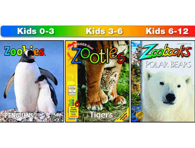 One year of wild animal learning fun with a subscription to Zoobies (6 issues per year) for kids 0-3, Zootles (6 issues per year) for kids 3-6 or Zoobooks (10 issues per year) for kids 6-12.