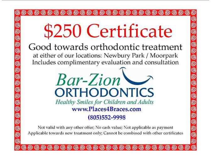This certificate is valid for $250 off an orthodontic treatment at Bar Zion Orthodontics. See certificate for specific details.