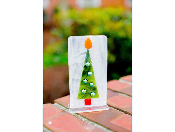 A standing glass ornament featuring a green Christmas Tree with iridescent detailing on a white marbling background.