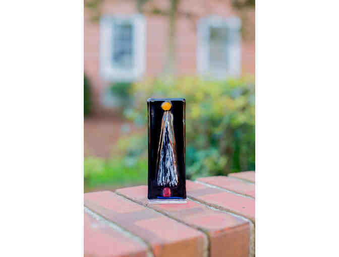 A standing glass ornament featuring a black and white Christmas Tree on a black background.