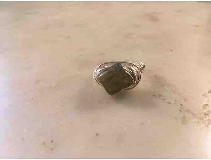 You are bidding on a stone and wire ring with a light green stone. Ring fits size 6.5-7 finger.