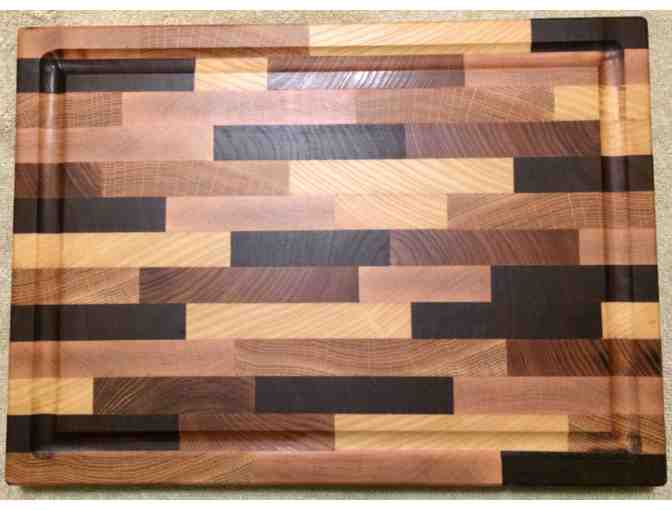 You are bidding on a handcrafted cutting board approx. 10” by 14” and 1” thick. This beautiful and functional cutting board was donated by K Weller Carpentry.