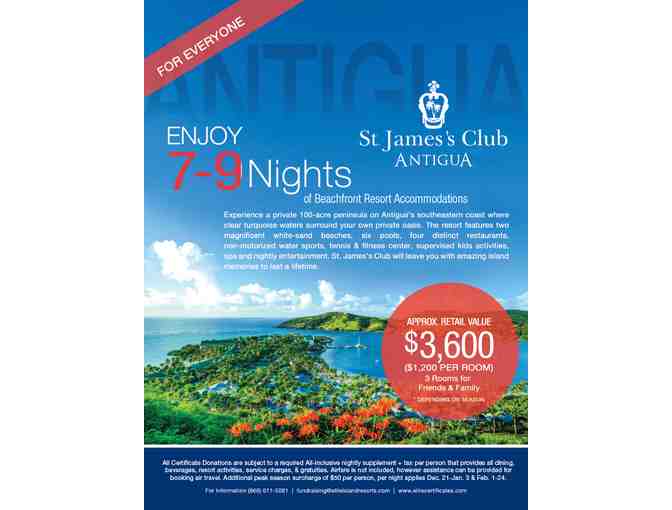 7 to 9 Nights of Premium Accommodation for Three Rooms Double Occupancy (valued up to $1,200 per room depending on dates of travel) at St. James's Club & Villas, Antigua. Experience a private 100-acre penninsula on Antigua's southeastern coast where clear turquoise waters surround your own private oasis. Two magnificent white sand beaches, six pools, four distinct restaurants, non-motorized water sports, tennis & fitness center, superbised kids activities, spa and nightly entertainment. St. James's Club will leave you with amazing island memories to last a lifetime.