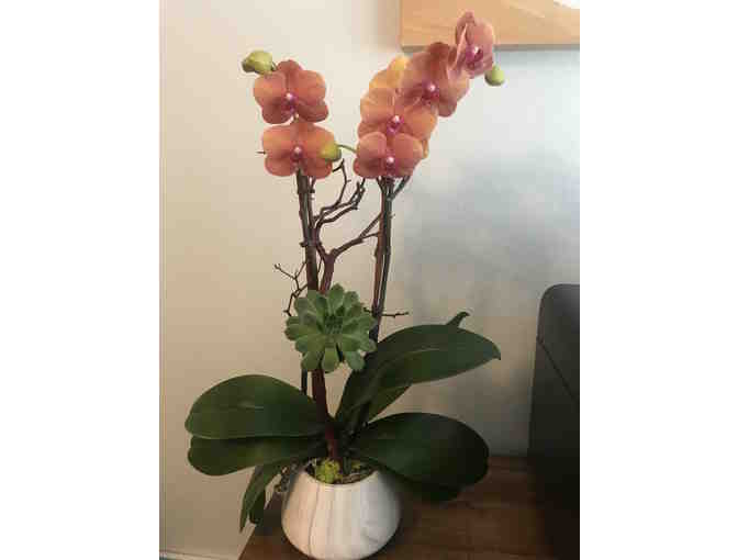 Beautiful live orchids in white pot with succulents and moss. Stands approximately 24" tall.