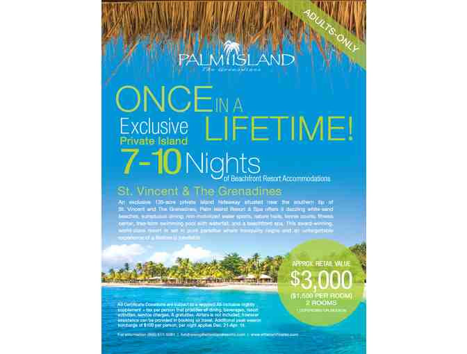 7 to 10 Nights of Exclusive Private Island Accommodation for Two Rooms Douple Occupancy (valued up to $1,500 per room depending on dates of travel) at Palm Island Rresort & Spa, St. Vincent & The Grenadines. An exclusive 135-acre private island hideaway, situated near the southern tip of St. Vincet and the Grenadines, offers 5 dazzling white-sand beaches, sumptuous dining, non-motorized water sports, nature trails, tennis, fitness center, free-form swimming pool with waterfall, and spa. This award winning world-class resort is set in pure paradise where tranquility reigns and an unforgettable esperience of a lifetime is inevitable.