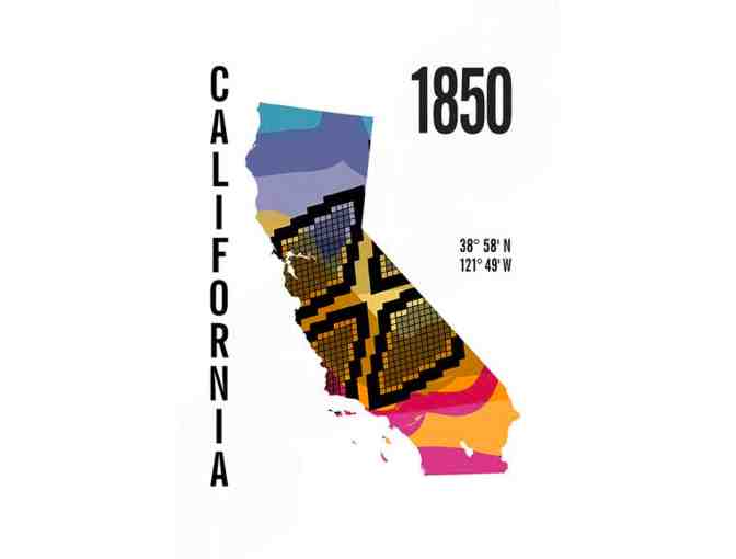 The California Map Print combines the year of statehood and coordinates for the city's capital - Sacramento, with a silhouette of the state of California filled with pattern inspired by a Death Valley sunset. This modern map print is the perfect wall decor for any one that has a special connection to the Golden state.