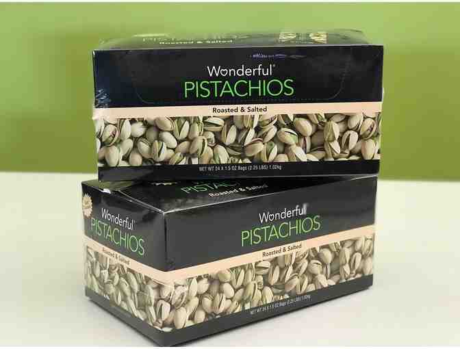 Includes 2 boxes of delicious Wonderful Pistachios. (24) 1.5 oz bags in each box, 48 individual bags total.