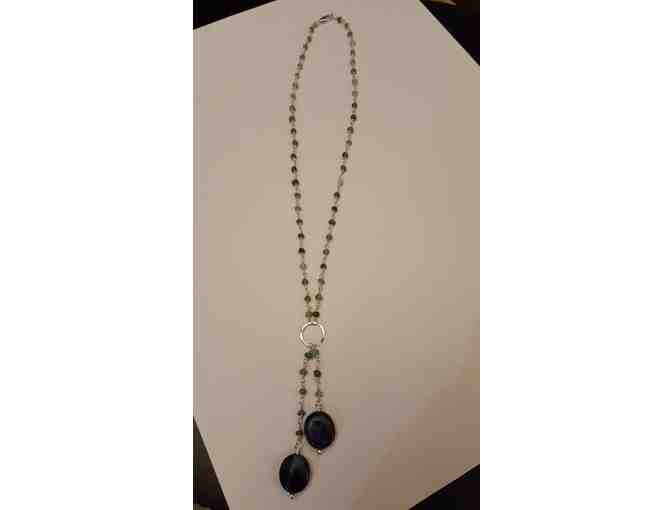 Two beautiful sodalite beads are suspended from an 18" green quartz beaded necklace.