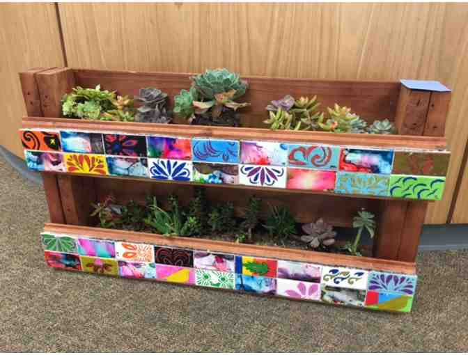 Planter box made out of a pallet and the kids painted white tiles; succulents added