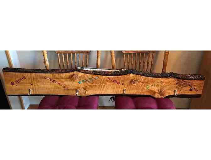 You are bidding on a handcrafted coat rack on a beautiful piece of natural wood. The rack measures five feet and has 4 hooks. This piece was made by a friend of camp, Sharon Carl.