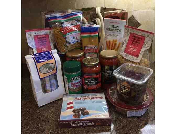 Italian themed goodies from Trader Joe's in a reusable burlap bag