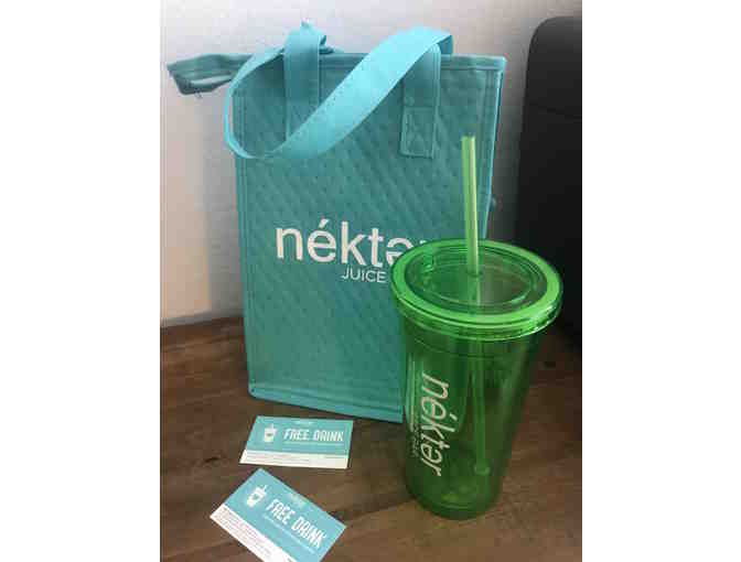 Your very own Nekter Juice Bar insulated tote, 24oz reuseable cup and 2 'free 16oz juice or smoothie' coupons.
