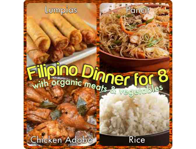 Enjoy a homemade multi-course traditional Filipino dinner made with organic meats and vegetables for 8 prepared by 4th Grade mom, Judy Olmo and 1st Grade grandmother, Norma Viola. These ladies will cook and deliver the following dishes for you: