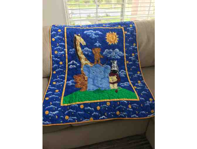 Baby Quilt - Blue with an elephant, tiger, lion, zebra, giraffe and bear in the middle surrounded by a blue border with clouds, suns, stars and mooms.
