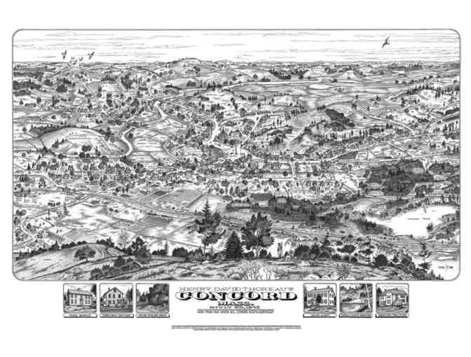 "Thoreau's Concord, circa 1845" depicts the world of Concord as it appeared the day HDT took residence at Walden Pond. Winner of two national art awards in 2006, this scene accurately shows the landscape and architecture of long-gone Thoreau's Concord.