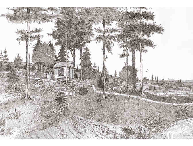 A detailed panoramic view of Walden Pond as it appeared during Thoreau’s time. The B&W print is 36” wide x 9” high and depicts Henry’s cabin, bean field, and surrounding landscape. This drawing was featured in the 2017 documentary film, “Henry David Thoreau: Surveyor of the Soul,” and was given an award of excellence from the Los Angeles Society of Illustrators’ 2017 annual illustration competition. Three prints are offered for auction. (Shipped rolled and with artists signature available.)