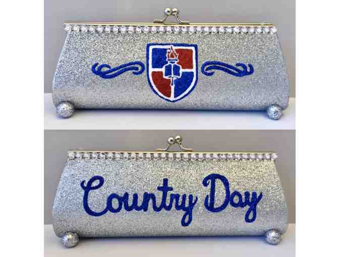 You are bidding on a one-of-a-kind Mardi Gras style glitter purse created by CD mom and Nyx member Rebecca Coatney. This small clutch purse measures approximately 8"x3" and features the Country Day crest and real crystal trim. The decorative glitter handle adds some sparkle, but can be removed for use as clutch. Also includes a removable chain for over-the-shoulder use. Show your school spirit and carry this glittered creation to your next formal event, or add it to your collection of signature throws!