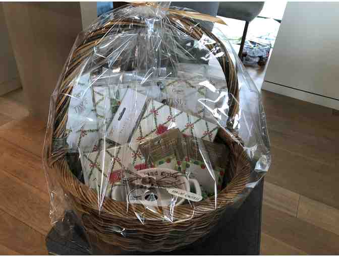 Basket filled with beautiful quality Caspari Holiday paper goods and a few extra holiday goodies. Put aside and save as the perfect hostess gift for the holiday season. Never too early for Christmas!