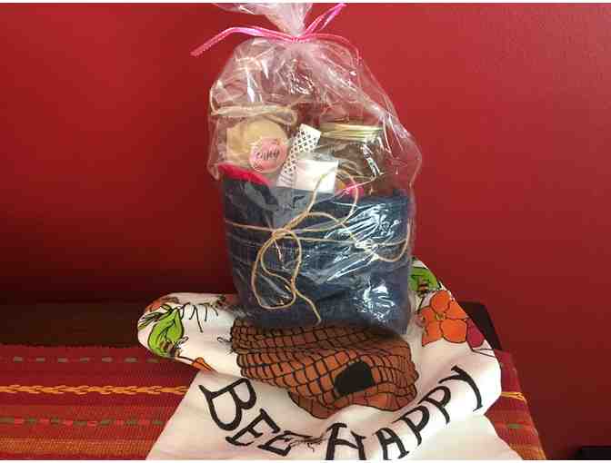 Honey Basket Includes: Raw, natural honey from Bee Hoppe beehives in Ogilvie, MN. Body Lotion products made with thier beeswax and honey: 1) Lavender Body Lotion Stick 2) Eucalyptus Body Lotion Stick 3) Bergamot Body Lotion Bar 4) Beeswax Lip Balm (Grapefruit-Mint) plus a Beehive-themed flour sack towel.