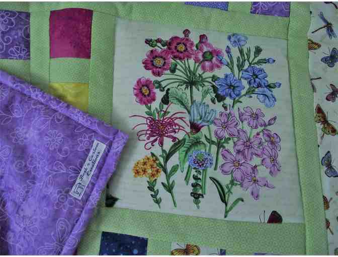 This gorgeous quilted throw is perfect for a toddler or for a cheery lap quilt for someone special. The throw is 44" x 57" and hand crafted by Barb Buker of Barb's Custom Creations of Chippewa Falls. The quilt has colorful spring butterflies and flowers on both the front and back.  It is 100% cotton with polyester batting and is complelely washable.