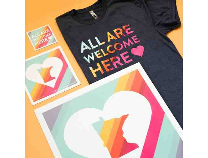 Get four of the most popular "All Our Welcome" items – the All Are Welcome Here lawn sign, tee (unisex L), print and car magnet – in the new All 4 One supporter pack! They are the perfect way to share a little positivity and inclusivity with family and friends.