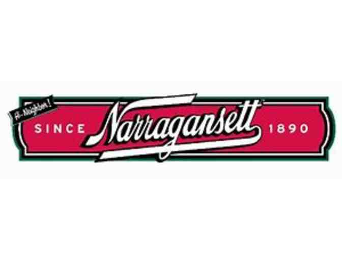 The 'Gansett Gear Bag is packed with all sorts of fun items! Our bag includes a pint glass, a beer coozie, a can of their famous lager, a black (XL) t-shirt, a "Hi Neighbor" bumper stickers, and a pack of 'Gansett bar coasters with their famous rebus puzzles on the back.