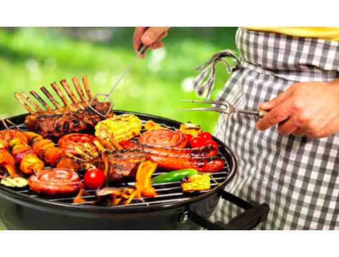 Man-Law smoker box, chips, Man-law grill, BBQ utensils, Grillbot automatic grill cleaner robot, Brillbot carry case to store, Stonewall Kitchen Bourbon Molasses BBQ Sauce