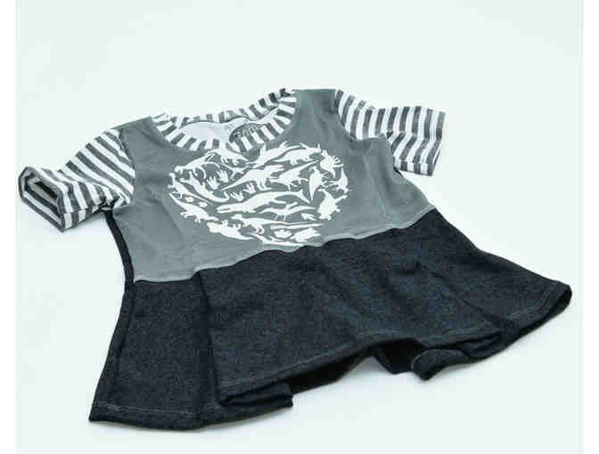 Your kiddo will love this dinosaur love peplum top made by Zenia. This handmade, super-soft knit t-shirt is a size 4T and features a cool image of various dinosaurs. It's short-sleeved and tunic-length, with just enough twirl-factor.
