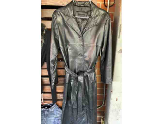 Black full length lined leather coat. Size XL but runs small. I would estimate it would be a large.