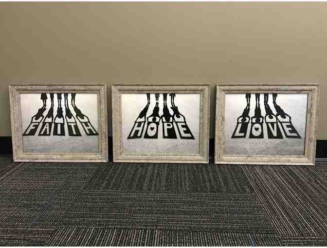 Each student is holding a letter sign that helps to create this framed shadow art.