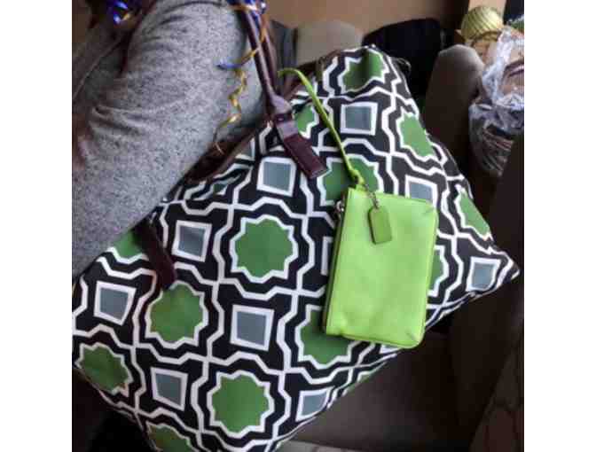 Lulu Dharma Tote Bag (multicolor, green/black/white) with Coach wristlet (green) and Kiehl's products...etc.
