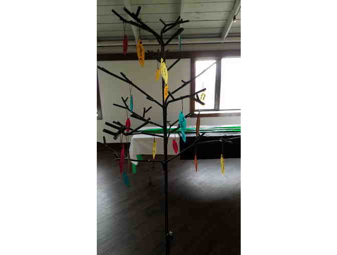 A new addition to the 7th grade projects, this 5' 6" handmade garden tree was designed and welded by 7th grade parent Don Faber. Sculpted and welded of rebar with a sturdy base and stakes to secure it in the ground, this piece will last a lifetime. Colorful glass leaves with the students' names on them complete this truly one of a kind garden sculpture.