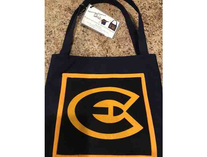 Celebrate your Blugold Pride by sporting this navy canvas tote, made by Mary Wells of Second Chance Chic, that reflects her exquisite workmanship, with the logo of the University of Wisconsin at Eau Claire. The bag is made of heavy canvas and is approximately 14" x 14" with magnetic snap closure and interior zippered pocket.