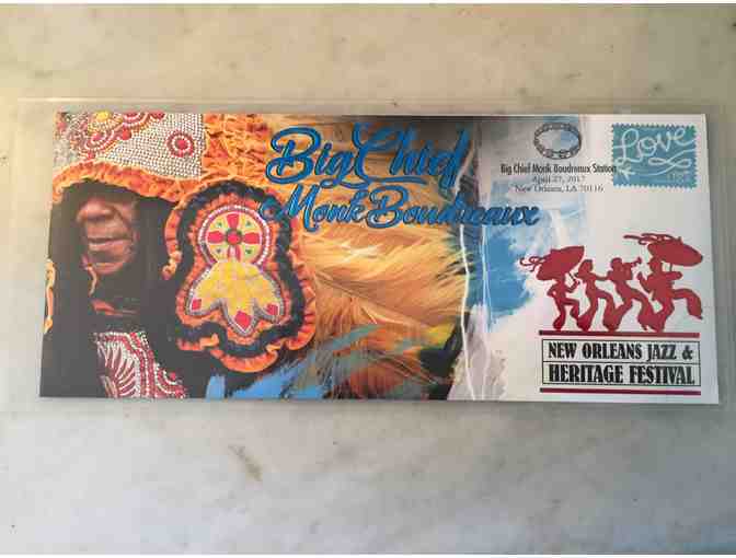 You are bidding on an official commermorative cachet from the New Orleans Jazz & Heritage Festival stamped April 27, 2017, Big Chief Monk Boudreaux. Housed in a sleeve to ensure it is in pristine shape. Perfect for the collector or Jazzfest fan. Limited edition - number 1627 of 2000.