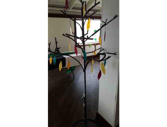 A new addition to the 7th grade projects, this 5' 6" handmade garden tree was designed and welded by 7th grade parent Don Faber. Sculpted and welded of rebar with a sturdy base and stakes to secure it in the ground, this piece will last a lifetime. Colorful glass leaves with the students' names on them complete this truly one of a kind garden sculpture.