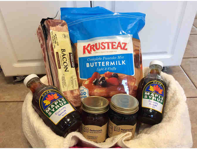 Enjoy a delicious morning with a breakfast basket filled with 2 pints of homemade maple syrup, Kruzteez pancake mix, bacon (3).