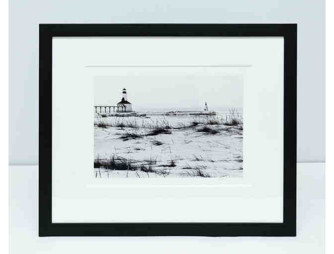 This professional matted, framed, black and white photograph of a dunes beachscape along the Michiana shore captures the mystery and beauty of a winter beach on a breezy afternoon.