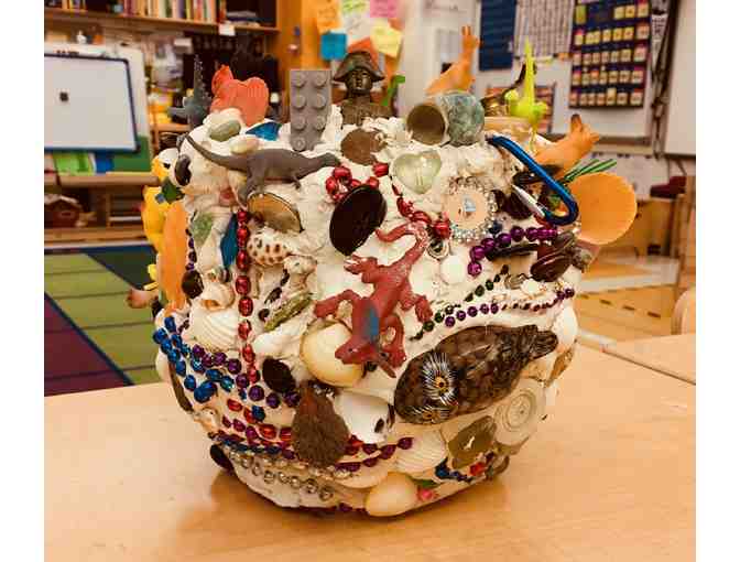 K-243 has produced three “memory ware” pieces for our class art. This one is FISHBOWL. Kids had fun molding the bowl with clay and covering it with toys and other meaningful objects they collected.