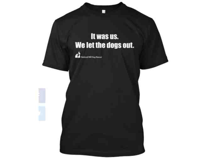 Black "It was us. We let the dogs out." Hanes, tagless, T-shirt. Size Large.