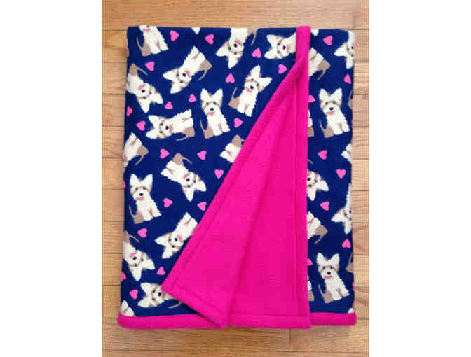 Handcrafted EllieBellie Project dog blanket measures 40" x 44" with a fun flannel print on the front and fleece on the back. Dogs love these soft and cozy blankets!