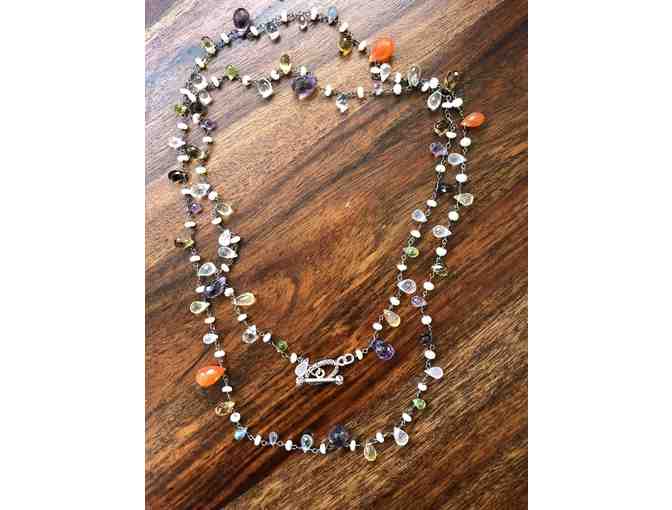 Long Silver, Gemstone and Pearl Lariat Necklace