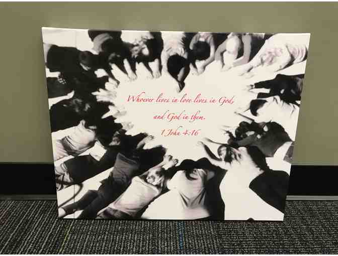 A picture of the students creating a heart shape with their bodies, surrounding a verse. The photo is printed on canvas.