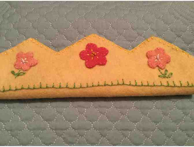 This crown was handmade by Hiromi Niwa, GMWS faculty and parent. For young children's imaginative play. It is made of plant dyed felt with embroidery.