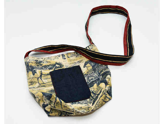 Up for auction is the "Back in the Saddle" shoulder bag, big enough for essentials and a book or tablet. 10"x11" with a magnetic button closure and a nifty inside organizational pocket for pens and a cell phone, as well as a good-sized exterior pocket for easy access to items.