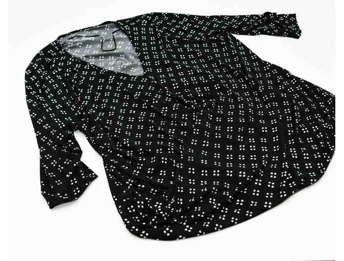 Black and white quad polka dot Boutique + top. Half-length sleeves with crossover drape at hem. Poly/spandex knit. Machine washable.