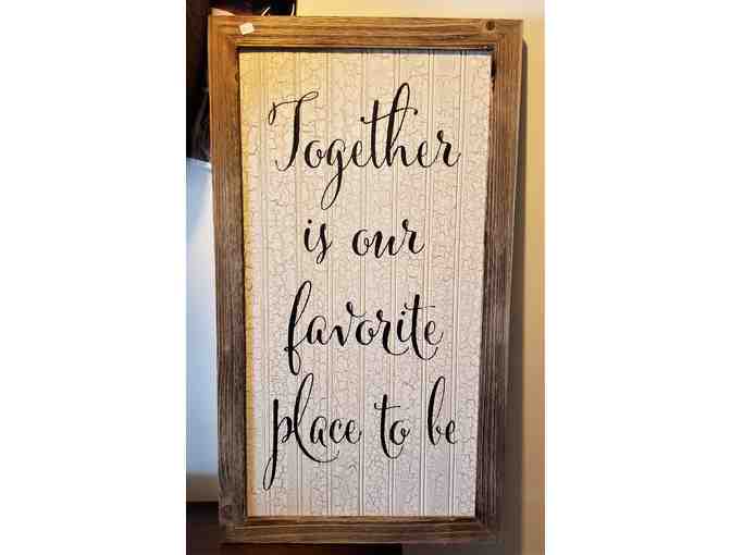 You are bidding on a rustic wall plaque. The frame looks like old barnwood and it says "Together is our favorite place to be".